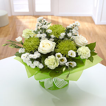Green and white for sheer elegance shown here with green bloom Chrysanthemum, palest green Carnations, white Roses, Lisianthus and September Flower.