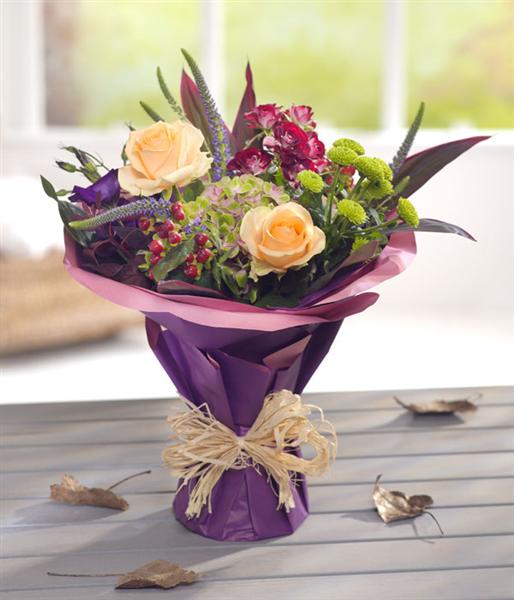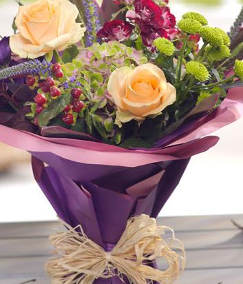 Velvety mauves and creams with a dash of pink. The mystery and magic of this season’s colours come together in the form of Roses, Hydrangea, Lisianthus, Chrysanthemums and Veronicas to create a uniquely dramatic flower bouquet.