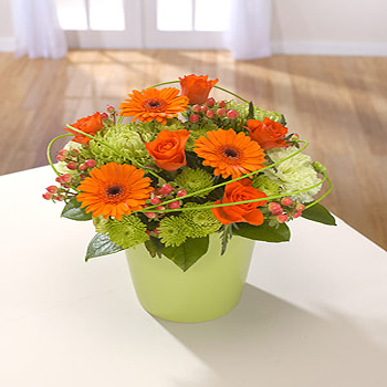 A warm and zesty mix of orange Germini and spray Chrysanthemum circled with delicate Salal. This arrangement is complemented beautifully by its green ceramic pot.