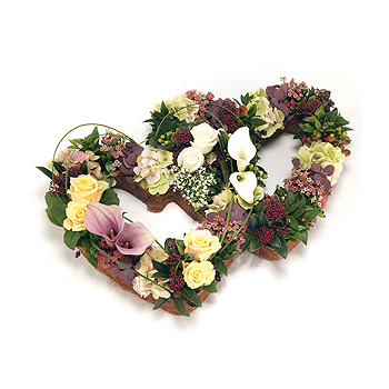 A stunning double heart shaped tribute in subtle colour scheme of pink, peach, bronze and lemon, including Lilies, Hydrangea, Roses and flowering foliage. Size: Height - 38cm (15") Width - 58cm (23").