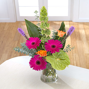 A contemporary mix of hot pink Gerbera and green Anthurium star in this tropical design. Purple Liatris and orange Roses bring warmth, while Aspidistra and Molucella form an elegant structure.