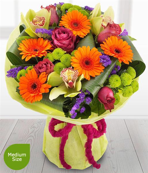 Green Cymbidium Orchids are nestled in amongst cerise Roses, orange Germini, purple Satis and green Spray Chrysanthemums. An absolutely stunning display that’s bursting with colour.