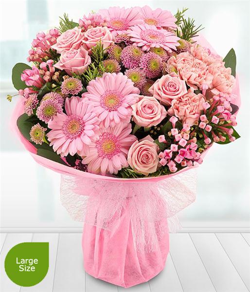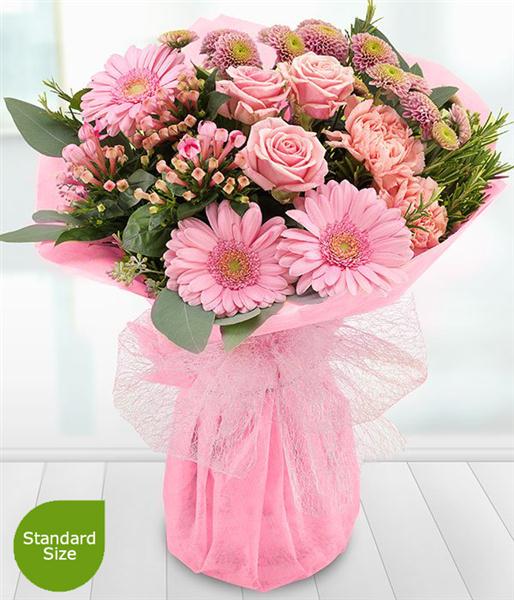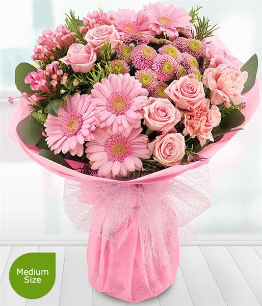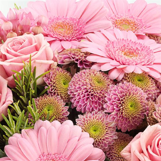 Pink Rose, Pink Germini, Pink Bouvardia, Pink Spray Chrysanthemum, Pink Carnation, Rosemary, Eucalyptus.