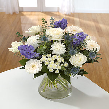 Whites all the way with Roses, Carnations and Chrysanthemums. Aconitum and Eryngium add the accents of blue.
