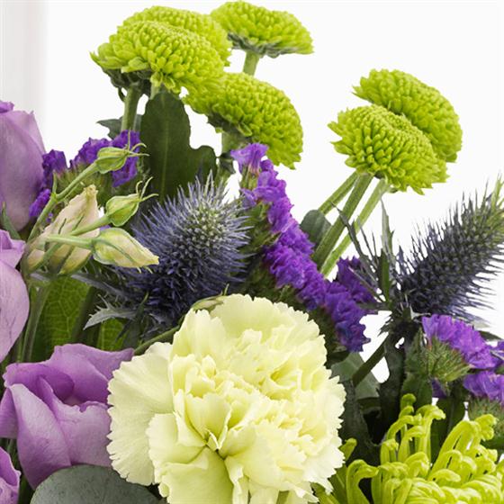 Includes Lilac Lisianthus, Purple Statis, Green Chrysanthemum, Green Spray Chrysanthemum, Green Carnation, Eryngium, Eucalyptus.