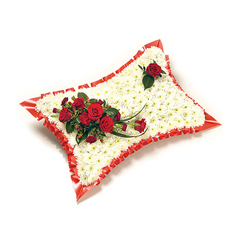 A classic white Chrysanthemum based pillow with ribbon edge. Featuring Roses, Carnations, Hypericum and complementary foliage. Size: Height - 33cm (13") Length - 51cm (20").